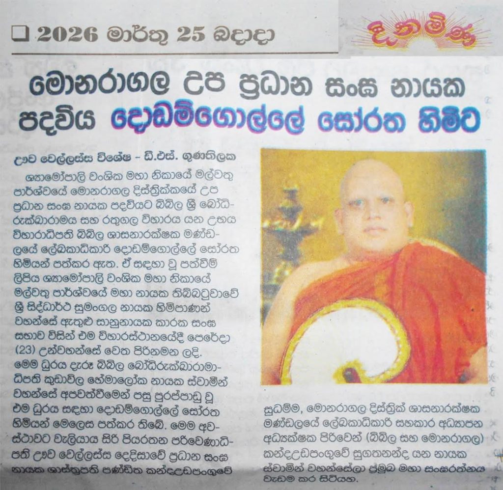 ශ්‍යාමෝපාලි වංශික මහා නිකායේ මල්වතු පාර්ශ්වයේ මොනරාගල දිස්ත්‍රික්කයේ උප ප්‍රධාන සංඝ නායක පදවියට බිඛිල ශ්‍රී බෝධි-රුක්ඛාරාමය සහ රතුගල විහාරය යන උභය විහාරාධිපති බිඛිල ශාසනාරක්ෂක මණ්ඩලයේ ලේඛකාධිකාරී දොඩම්ගොල්ලේ සෝරතහිමියන් පත්කර ඇත. ඒ සඳහා වූ පත්වීම්ලි පිය ශ්‍යාමෝපාලි වංශික මහා නිකායේ මල්වතු පාර්ශ්වයේ මහා නායක තිබ්බටුවාවේ ශ්‍රී සිද්ධාර්ථ සුමංගල නායක හිමිපාණන්ව හන්සේ ඇතුළු සානුනායක කාරක සංඝ සභාව විසින් එම විහාරස්ථානයේදී 2026/03/23 වන දි​න උන්වහන්සේ වෙත පිරිනමන ලදි.